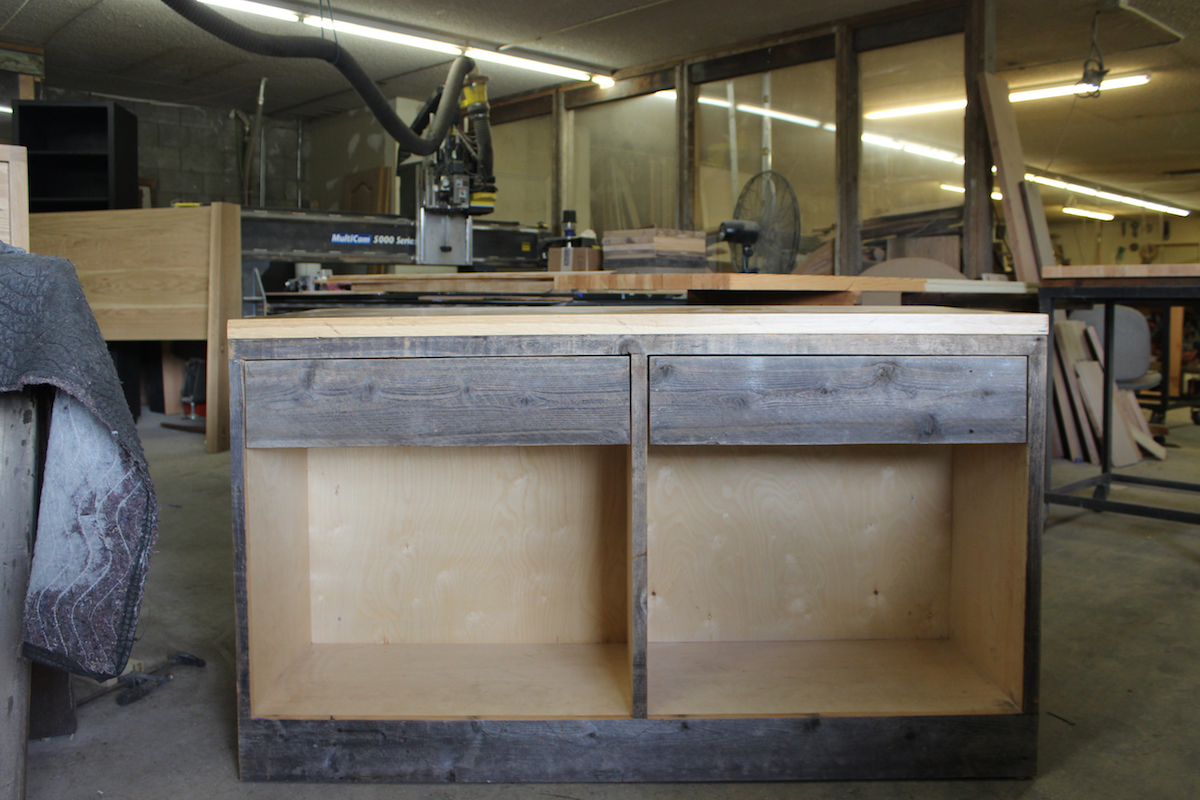 Carefully crafted cash wrap and hosting stand for a restaurant with a built in planter in the front and some storage in the back.