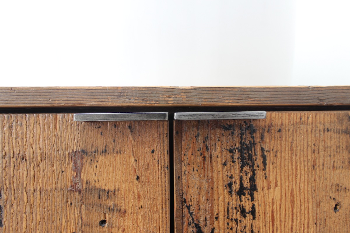 Carefully crafted with 100% reclaimed lumber and installed on site in a recently, and thoughtfully, renovated Silverlake bungalow, this vanity boasts simple, elegant build with custom made pulls with clear coated raw steel.